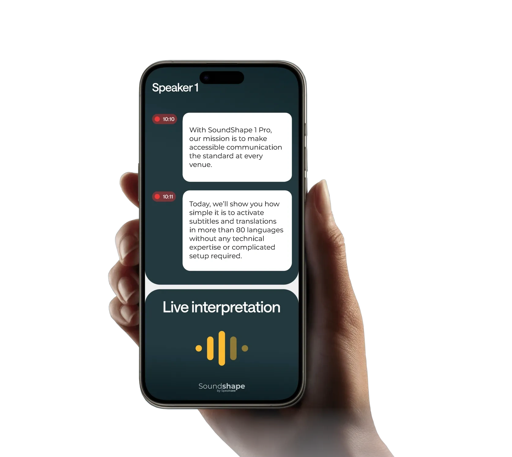 Soundshape is the AI powered solution for making events accessible to deaf, hard of hearing, international and neurodiverse guests with live captioning on the venue’s screens, audience members' mobile phones and video streams.